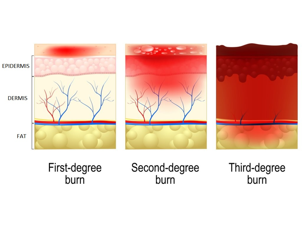 Doctors categorize burns based on how deeply heat damages the skin layers. The skin contains three main layers: epidermis, dermis, and deeper structures like muscle or bone.